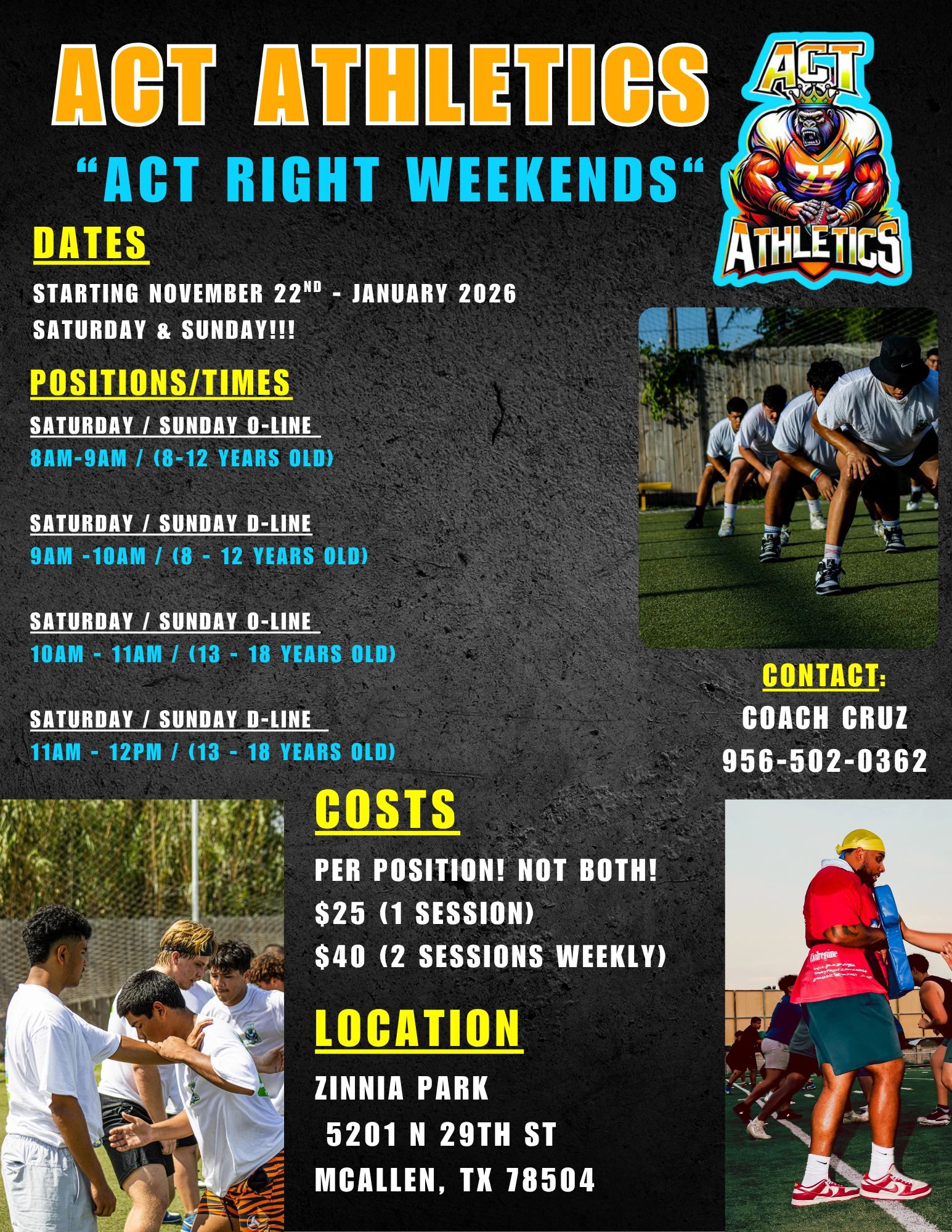 Each session is 1 hour in length, 2 sessions on Saturday & Sunday, check times above for ages & positions. This is weekly payment for 2 sessions on the weekend, no session will be rolled over if missed. Any questions please contact Coach Cruz.
